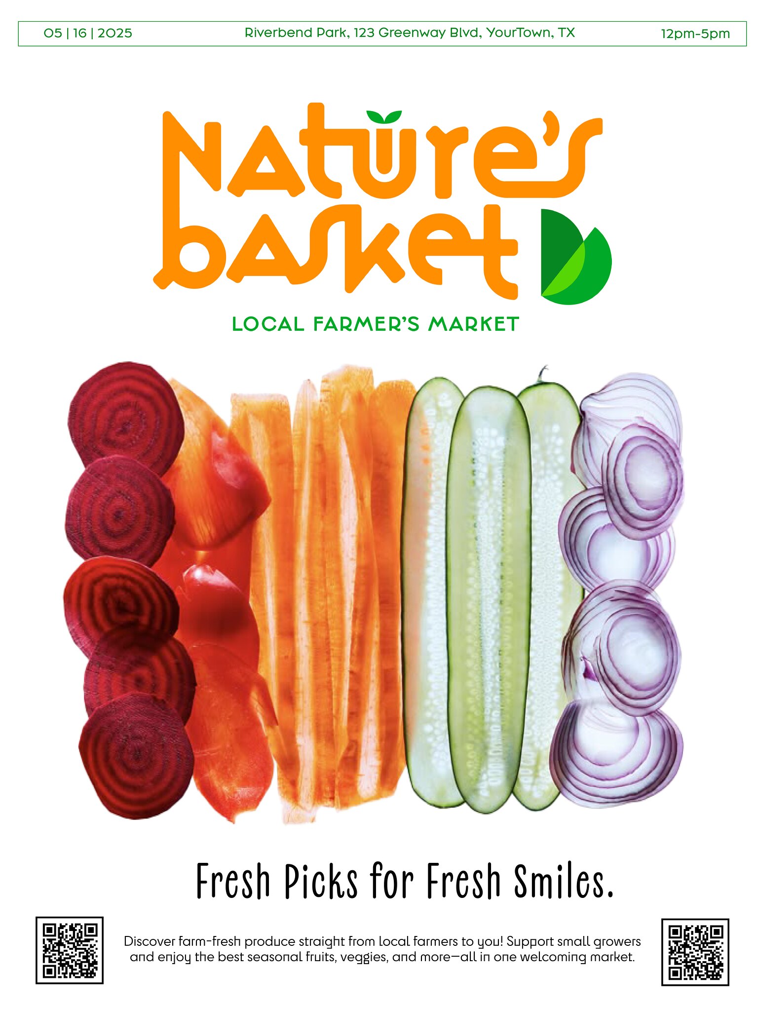| Work Title: Nature’s Basket Flyer Competition: UDA Poster Design 2025 Awards (Int’l Design Competition) Award-8: Silver (Student) Award of UDA Poster Design 2025 Competition Winner: Sandrine Agbeko Instructor: Ping Xu Course / Semester: ARTS-4334: VCD III (Graphic Design II) / Spring 2025 |