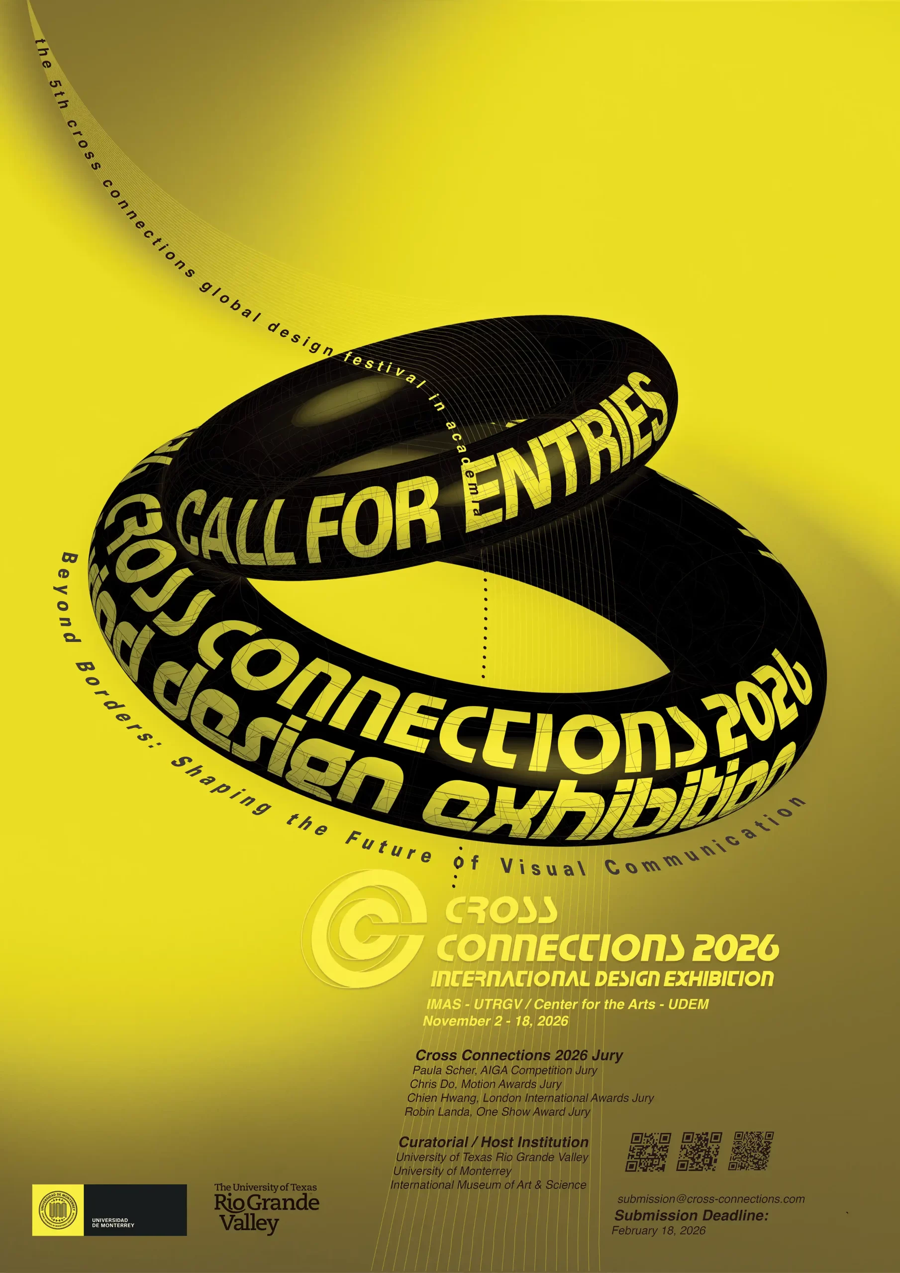 The Call for Entries poster was designed for the Cross Connections 2026 International Design Exhibition. It features the iconic double “C” symbol representing the event. The title “CROSS CONNECTIONS 2026” and its descriptors gracefully arc along the outer “C,” while “CALL FOR ENTRIES” is seamlessly shaped to follow the inner “C.” This design not only captures the core identity of the exhibition but also emphasizes its global scope and inclusive spirit, positioning Cross Connections 2026 as a vibrant celebration of creativity and design innovation. As the event curator, I created the poster using the UDEM yellow color theme to embody these values.