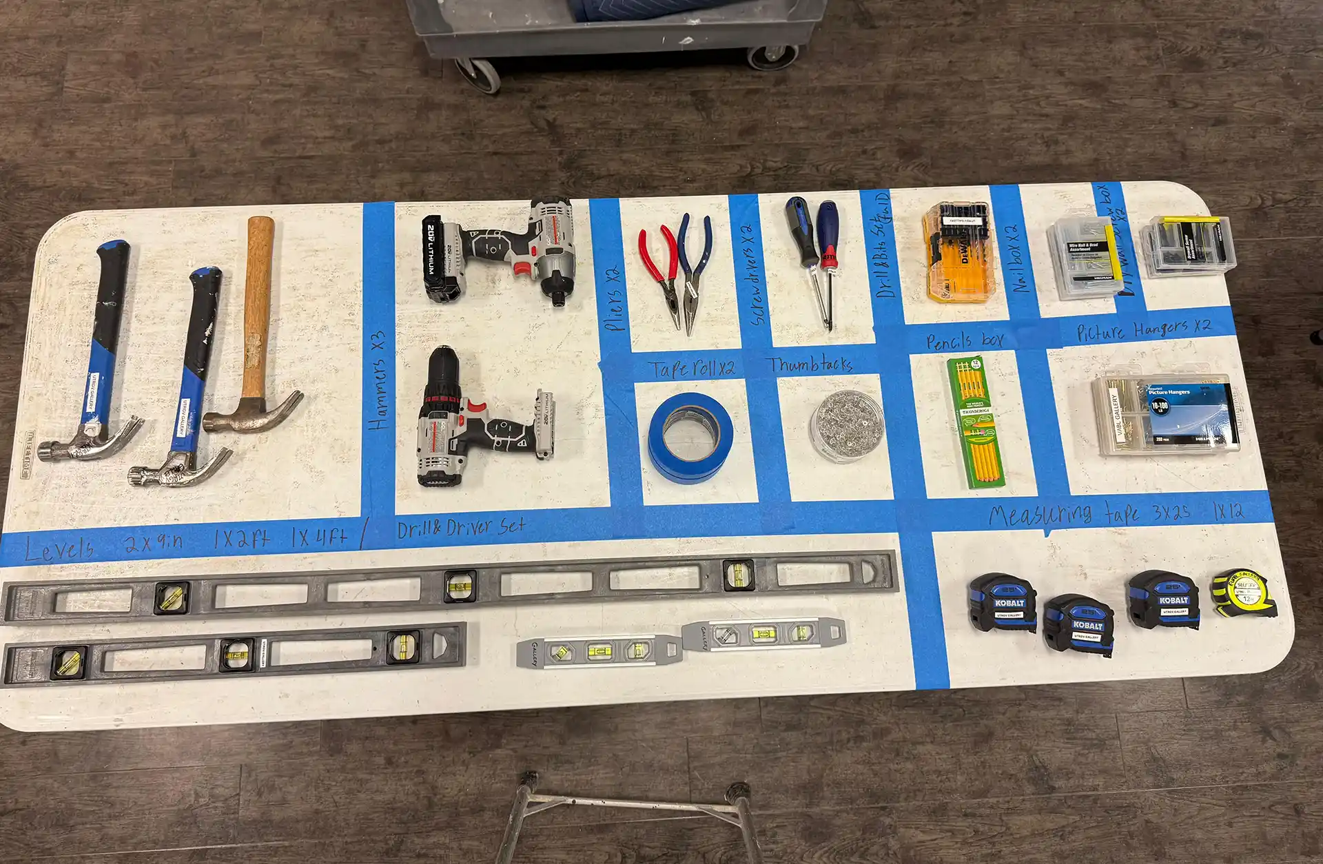 To install the show, a table with tools will be available for use. Please make sure all tools are returned to their designated spots when not in use and after installation. I’ve attached an image for your reference.