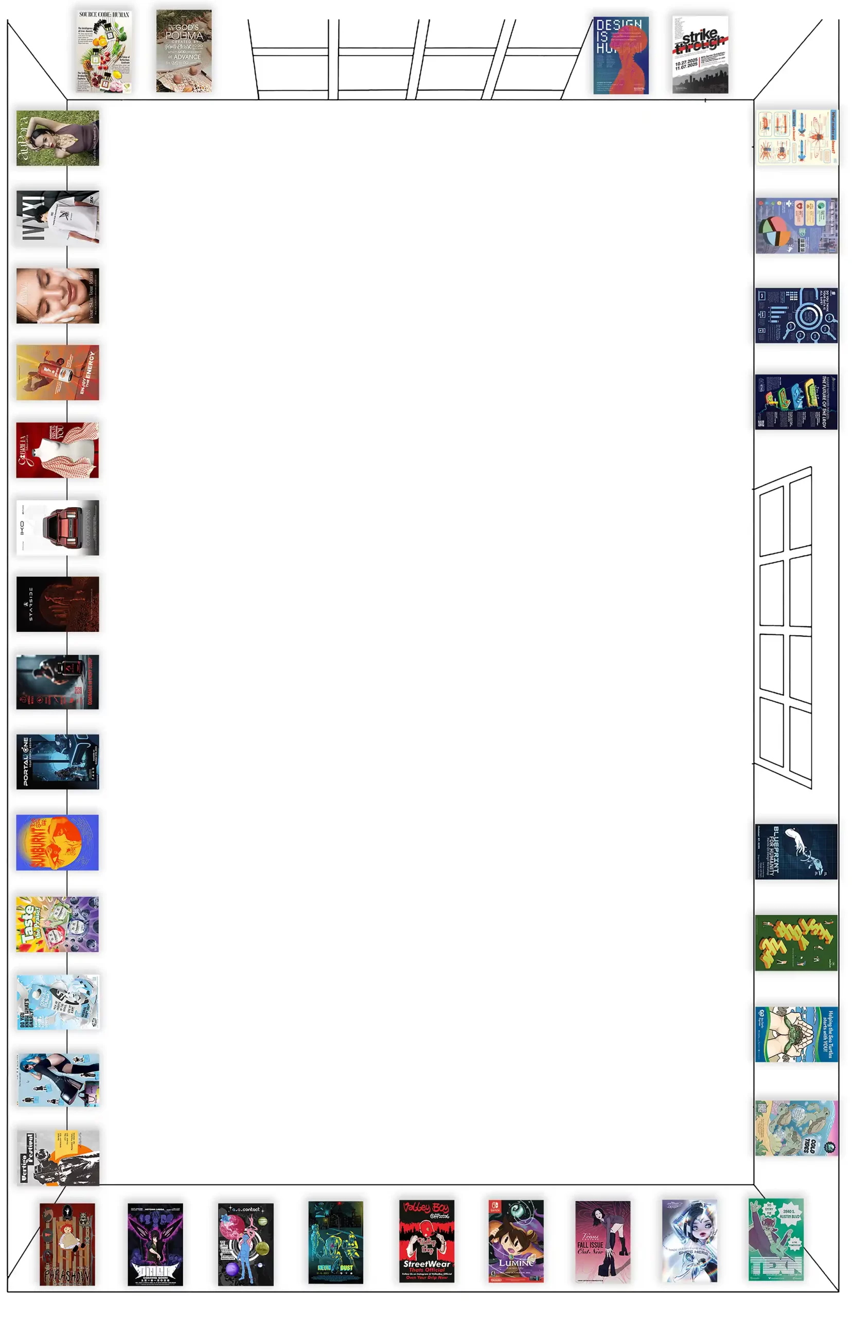 The entire class, including all installation teams, will begin installing at 4:45 PM on Monday. Please refer to the installation order in the image below. Bring blue tape and command strips for mounting your work. We will use Monday evening as well as all of Tuesday and Wednesday to complete the full installation. I have spoken with Professor Choi and Professor Corinne, and they have agreed to excuse your absence during this period for the installation.