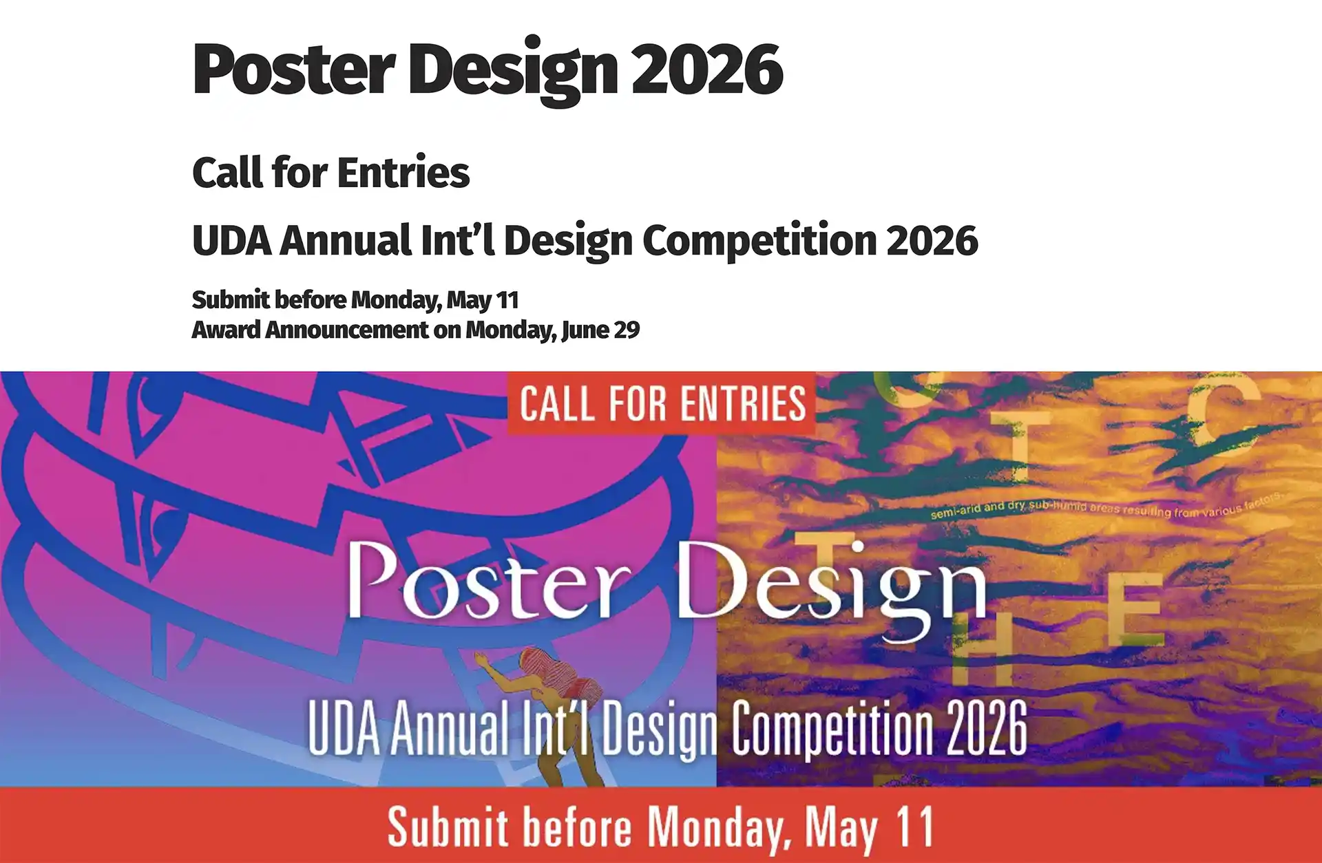 If your instructor is a UDA member, you can submit up to three entries for free. You’re eligible to submit up to three posters at no cost if they were created in one of my classes. Please use the provided entry forms when submitting your work.